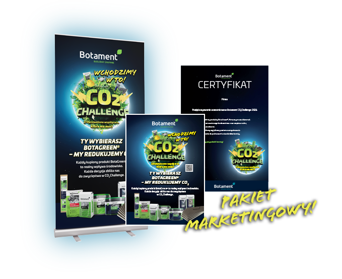 Nasze wyzwanie CO₂ Challenge to sposób, aby pokazać, że zrównoważone budowanie naprawdę się opłaca. Wybierając produkty z linii BotaGreen®, ograniczasz emisję CO₂ – w porównaniu do standardowych rozwiązań Botament – a tym samym realnie wpływasz na środowisko. Dzięki temu możesz pokazać swoim klientom, że stawiasz na nowoczesne, odpowiedzialne rozwiązania, które nie tylko wspierają planetę, ale też budują przewagę konkurencyjną.